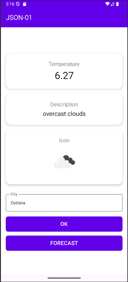 Android aplikace, která zobrazuje aktuální počasí a předpověď pomocí OpenWeatherMap API. Registrujte si API klíč na portálu OpenWeatherMap. Pro síťovou komunikaci a práci s JSON můžete využít znalosti z přednášek (např. knihovna Volley).- (první obrazovka) Aktuální počasí - Vytvořte uživatelské rozhraní obsahující alespoň tři oblasti (např. Card) zobrazující: aktuální teplotu, textový popis počasí, grafickou ikonu odpovídající stavu počasí. Dále implementujte vstupní pole pro zadání názvu města (můžete také ukládat/persistovat naposledy hledané město). Přidejte dvě tlačítka: jedno pro aktualizaci dat a druhé pro přechod na obrazovku předpověd počasí (Forecast). - odkaz na ikony