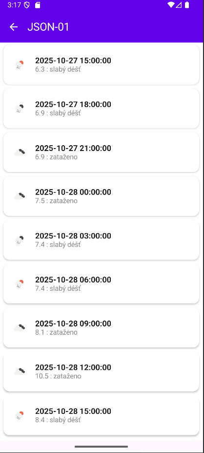 - (druhá obrazovka) Předpověď počasí/Forecast - Zobrazte seznam předpovědí na následující dny. Položka seznamu by měla obsahovat datum, čas, teplotu, popis a odpovídající ikonu.